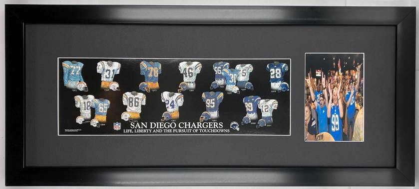 Framed Evolution History San Diego Chargers Uniform Print with Your Photo: Framed with our classic, smooth black frame