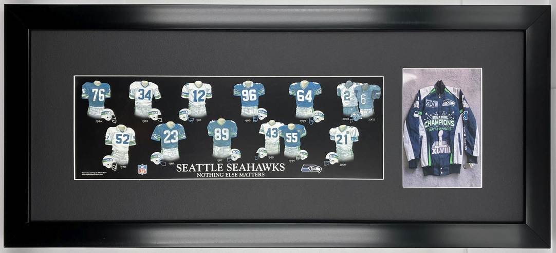 Framed Evolution History Seattle Seahawks Uniform Print with Your Photo: Framed with our classic, smooth black frame