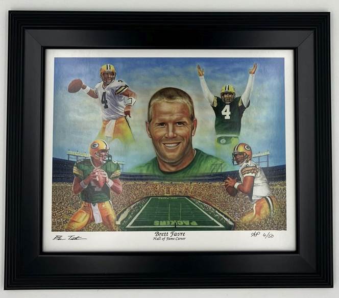 by award-winning sports artist Ben Teeter showcases Brett Favre. Measuring 8